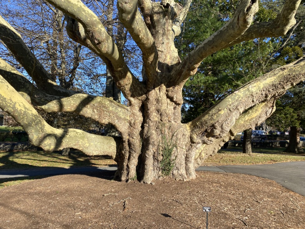 I was in Newport Rhode Island in the beginning of December Newport is a great place to go if you like trees At the turn of the nineteenth to twentieth century gardening was popular among the elite. Plant explorers were circling the globe in search of hardy plants that would grow in the USA uk France and other places in Europe. Everyone had to have the latest and greatest new cultivar or species. The plants were collected like trading cards. It was an exciting time in horticulture. The tree in the photo is a London plane tree which is a cross between the American sycamore and a Chinese species of sycamore. It is easy to distinguish the difference as the London plane bears its seed balls in clusters of two. The American sycamore �buttonballs� are born singly. usually the London planes are a cream colored mottling and Americans are a white mottling.