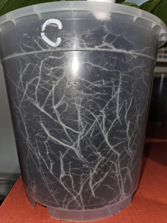 Pot C contains just Wallace Wow Mychorrizes. Each pot is made of clear plastic to check the roots but I placed them inside another black pot to avoid to expose the roots to the light. The roots in that pot are very well developped.