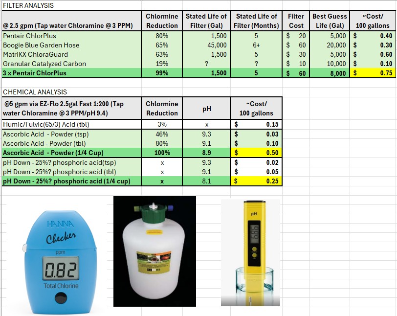 Trying to get end result of pH of ~6 and 0ppm of Chloramine, starting with my tap water (9.4pH/3ppm). I'm looking around $1.00/100gal at this point...