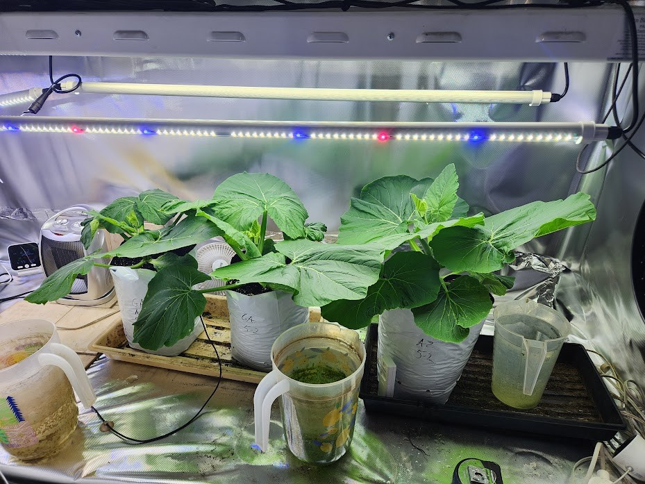 Test plants are 20 days old and vining out. I shut the T5's off on Friday before I left but left the Led's on. haven't fed anything but water, and think they look amazing. We're getting Closer to Go time!
