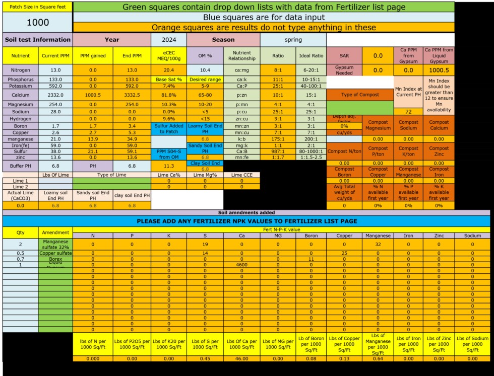 I will be making minimal adjustments this year adding some Manganese, Some copper, some boron and some liquid gypsum to boost the calcium.