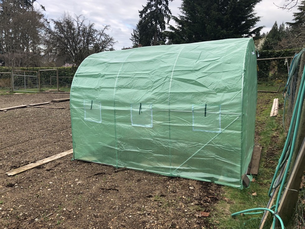 Larger hoophouses will be used for starting the plants this year, certainly an upgrade from our home made hooptie houses that were quickly outgrown by the plants. This one is 10x7x7 and will be taken off when the plant outgrows it. Soil heating cables and overnight heater and fan to be installed next.