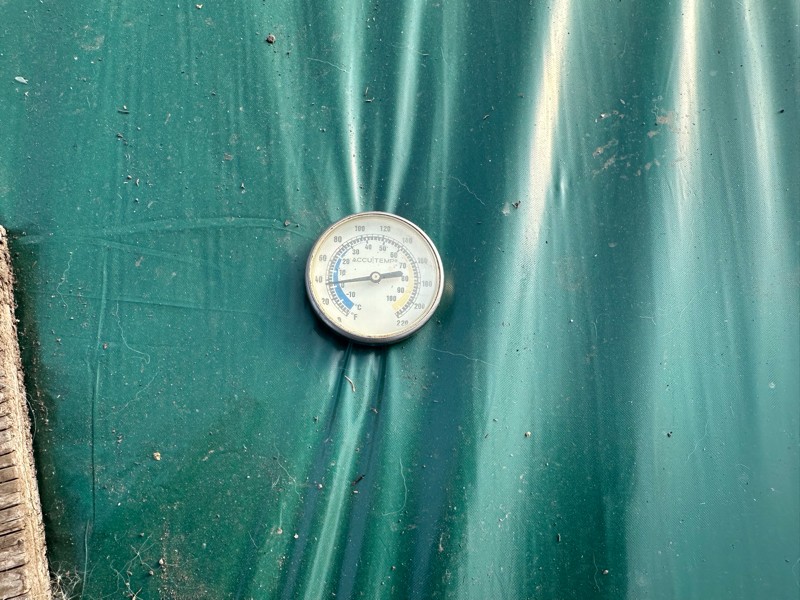 Outside the temporary cold-frame,inside the greenhouse, the soil is still chilly but making good progress.