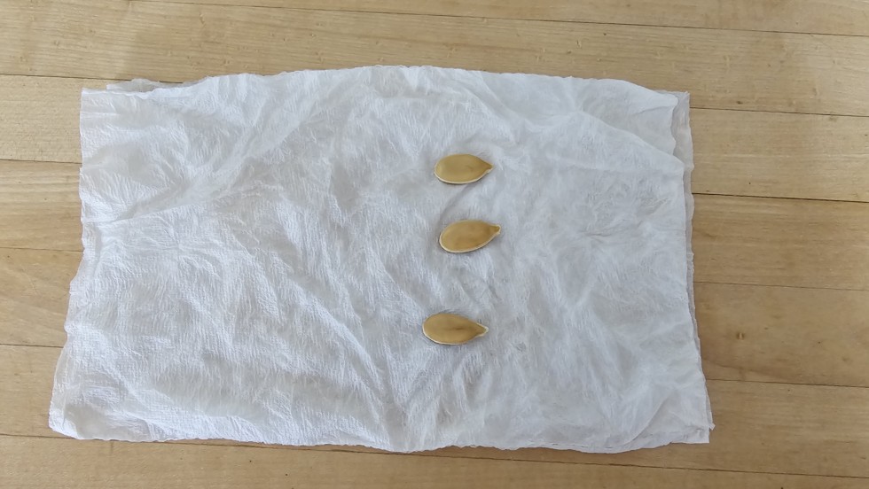Place the seeds on the "dry" paper towels and fold in half. Place them carefully in the ziplock bag. Make sure the seeds are in the same position within the folded paper towels.