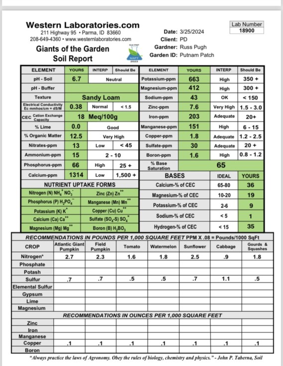 I have two separate growing areas. This is the soil test for my patch in my neighbor's (the Putnam's) backyard. I like the 6.7 pH! I don't like the super-high numbers for Potassium and Magnesium. I also don't like the ratio of Calcium to Magnesium in the CEC. My organic matter is on the high-side as well, but my patch is well-drained & is a sandy loam, so I have been pretty much disease-free in the three years I have grown in this patch.