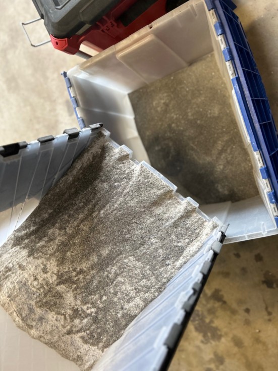 My final mix of the micro-nutrients is pouring the blend back & forth between a couple plastic flip-top bins several times, just to make sure everything is distributed evenly. I wear a mask when I mix this stuff. I hate wearing masks. Maybe it is needing to wear a mask that makes me not like doing my soil amendments?
