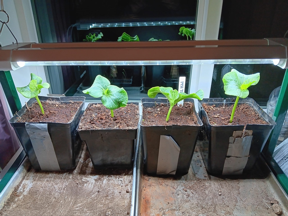 After 12 years my T-5 grow light bit the dust. I am kind of glad it did. I purchased a new LED Light and it's much brighter than the old one. Plants are looking strong with the first true leaves out. I also watered in some essential and some companion today. Trying to get that Biology ramped up early.