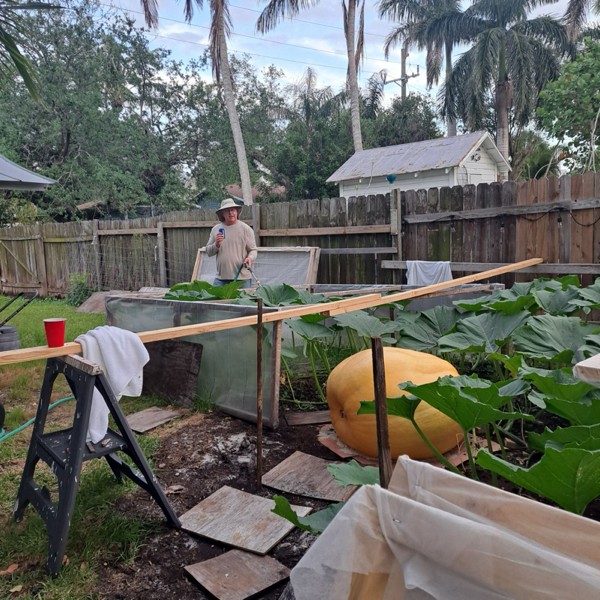 Atta boy Tim! We pumpkin growers know how to multi task. ! Watering, having a beer and admiring the fruit of your labor ! It's a fun stage of the season as it's day 29 and the pumpkin is just beginning to kick it into gear.
