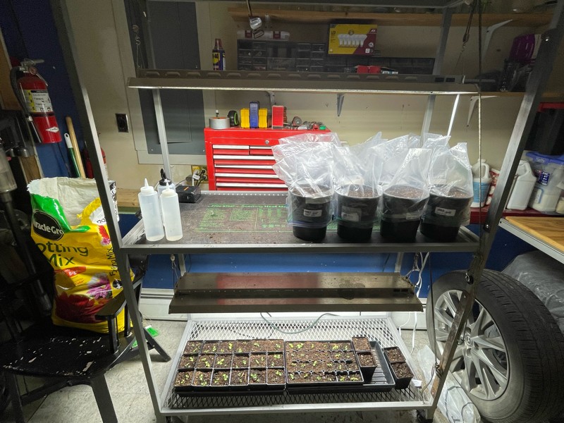 Our grow bench is starting to fill up. I don't use a seed starting chamber but do use a heat mat to warm up the pots and use gallon ziplock bags to keep moisture in. Our son built the grow bench for us with each shelf being 3 foot high with the led light bars being fully adjustable.
