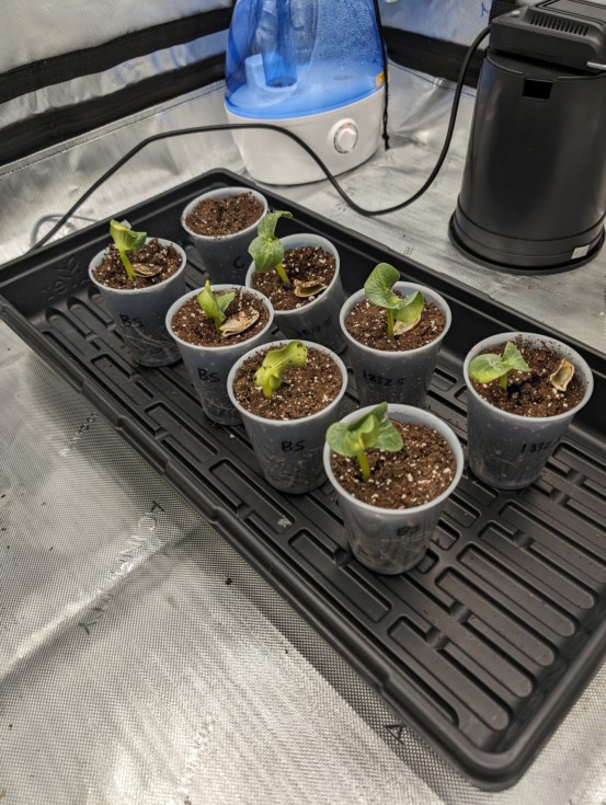 The seeds all sprouted Sunday evening / Monday morning. Here they are on Monday evening in the grow tent