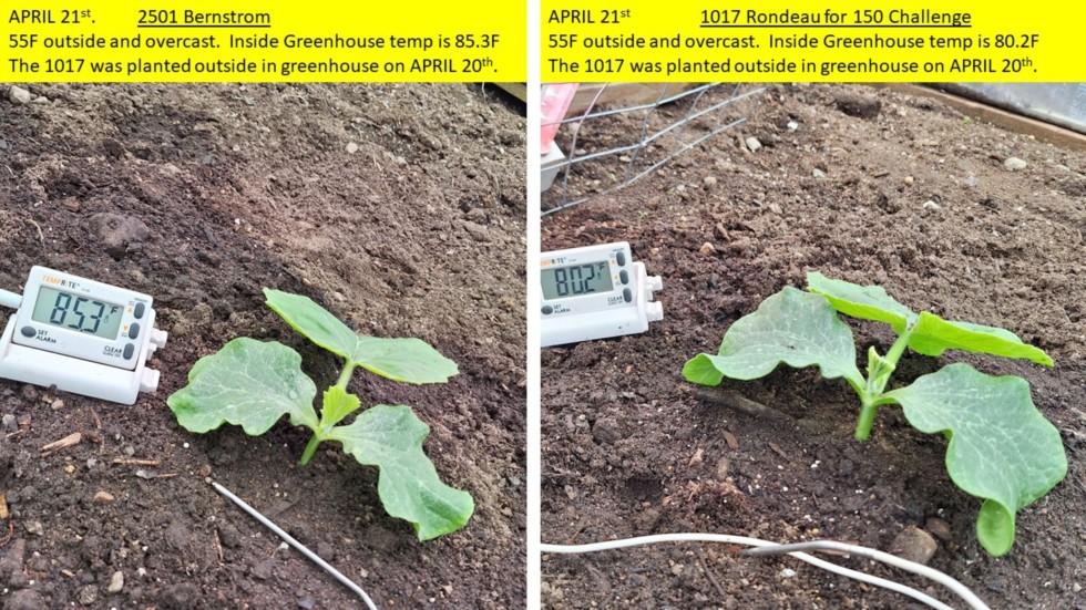 The 2501 Bernstrom and 1017 Rondeau. (both Planted April 10th)., were showing 2nd true leaf, so I moved them to the outdoor greenhouses yesterday. Was 37F last night, (plus a frost in localized area's of our yard), But with the heaters all night and covered mini quonset huts, it was 73F inside the huts. The plants dont seem to be in any stress today. Todays daytime outdoor temps are 55F and overcast. The greenhouse temps have risen to the low 80's from solar energy, as shown..