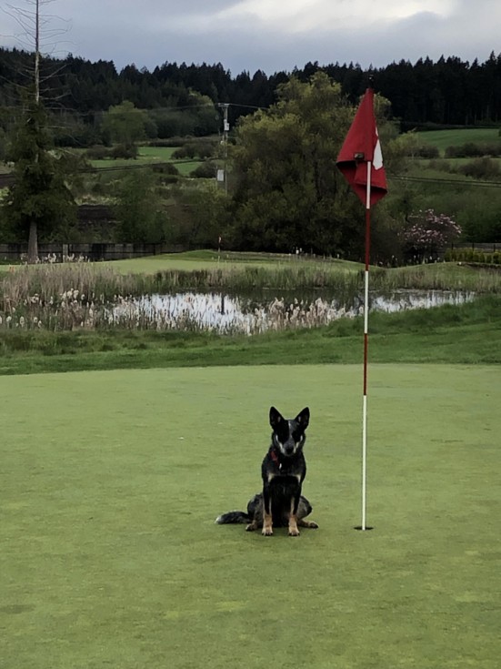 Here is our Australian Cattle Dog (aka Blue Heeler) on duty at the Arbutus Ridge Golf Club. She is making sure the fairways, greens and ponds are clear of the pesky flocks of Canadian geese. Many areas have problem geese (golf courses, parks, lakes, farmers crops) and Tova has been specially trained to only clear the Canadian Geese and not anything else.