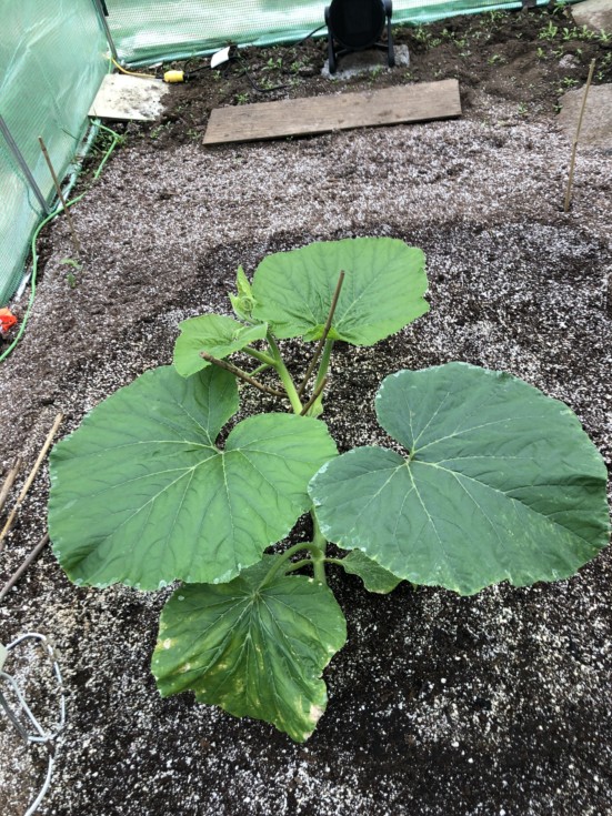 1995.5 Hoornstra needed the kickstand leaf (2nd true leaf) trimmed off so that the vine could lay down safely, and now I see that the first true leaf is looking old and will likely get the chop as soon as more leaves are on the scene. Some mild chlorosis from some chilly nights and cold surrounding soil outside the heated soil cable area. Things are warming up now, soil biology should be working but I still might add some Ureamate and Masterblend to a watering and a foliar feeding to give it a mild boost.