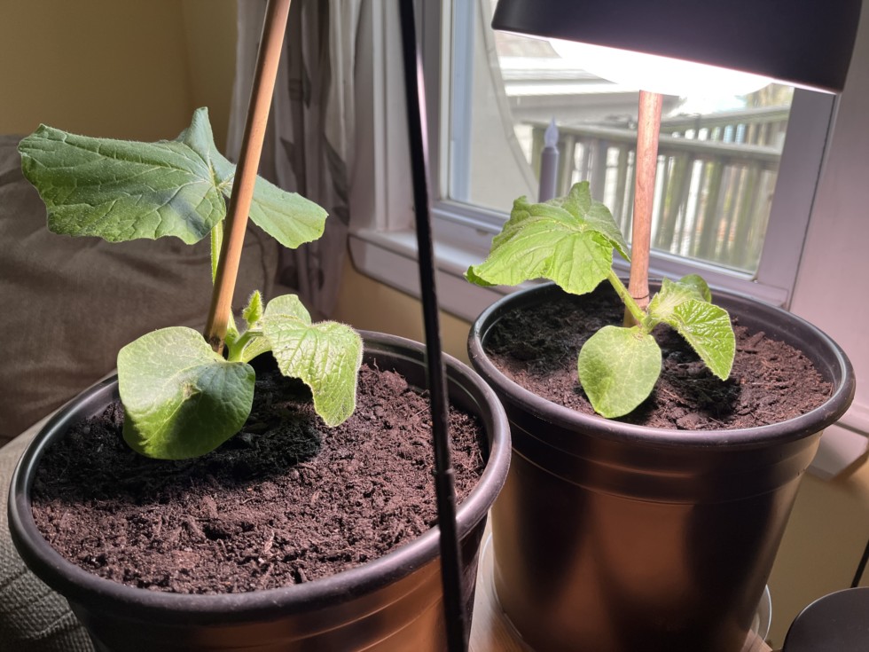 Much better now in two gallon pots with stakes.