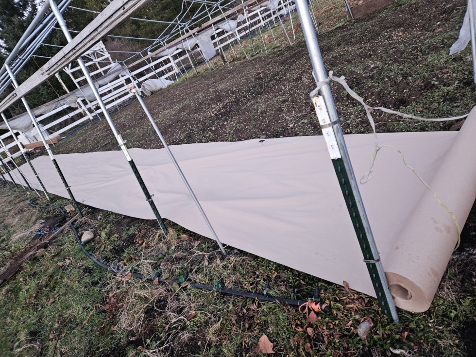 After putting down some organic amendments, I covered the patch in paper and hand tossed a layer of finished compost on top. In order to avoid compaction, I hauled my wheelbarrow to the edges of gh1 and threw shovelfulls of compost on top until it was about 3 inches deep.