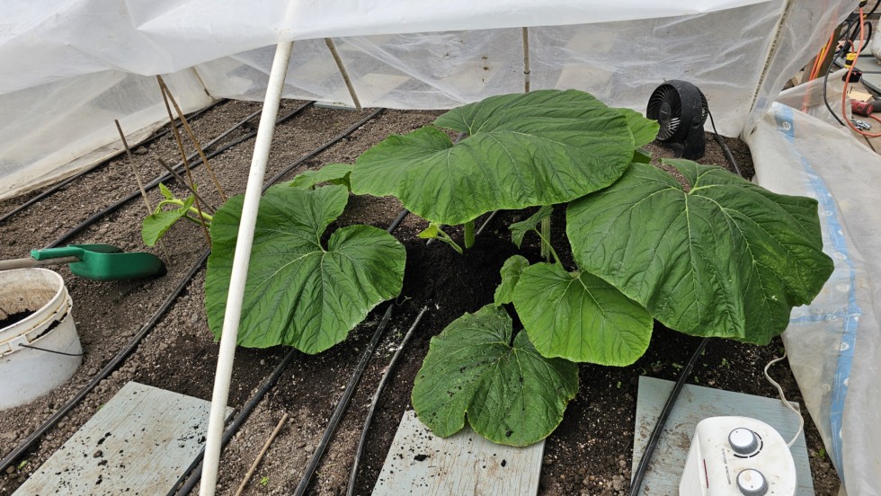 Barron 2404 about 6 ft long 37 days from soaking. Today was the 1st day of vine burying because the secondary roots are popping out of the nodes. I'm trying a slightly different method of burying vines this year. Last year I mixed everything into the mixture and then covered the vines. This year I'm spreading some Azos and Mykos under the node and then burying with a 50/50 mixture od compost and sand. Diluting with sand because the compost is super rich. Last year I didn't water in the burying mixture. This year I'm drenching the mixture on the vines with a concocotion of biologicals. So just to repeat myself, which I do a lot more of as I get older, I still have not given the plant any "fertilizer" of any sort. I know everything the plant needs is in the soil. The experiment is to see if adding lots of biologicals will make the system more efficient. Seems to be working. Those big leaves are 2 ft across. I don't know if that's a good or bad thing.