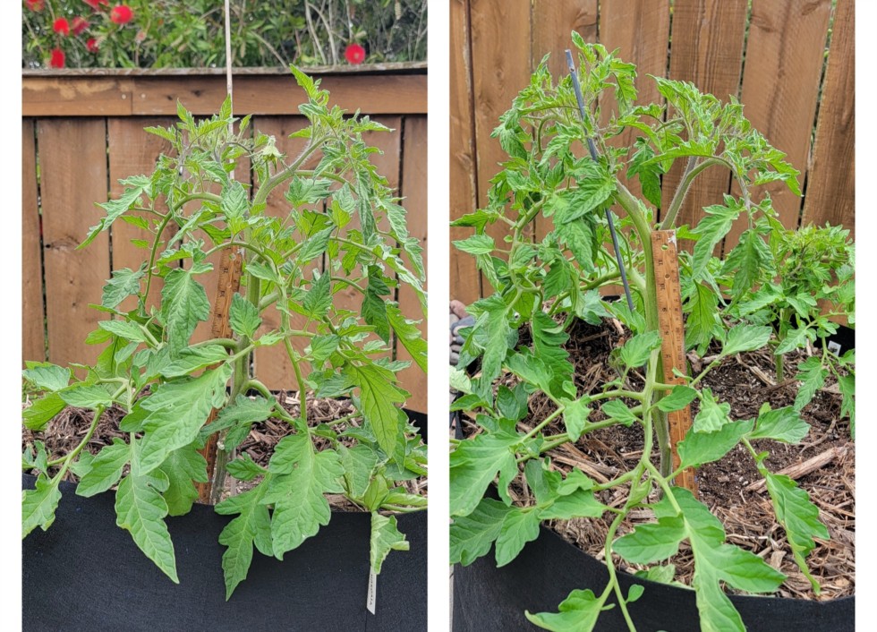Cowpot experiment results. See my Apr 1 diary entry for the premise. Plants are now 49 days old & their truss 1 buds are about to open.