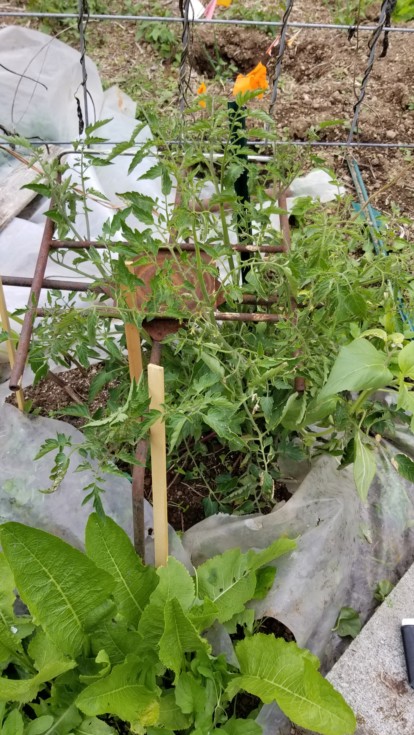 The volunteer tomato. If I had started my giant tomato plants sooner, then they could all be this big. A bigger plant isnt better if its just a big mess, with unsolved nutrient issues, though.