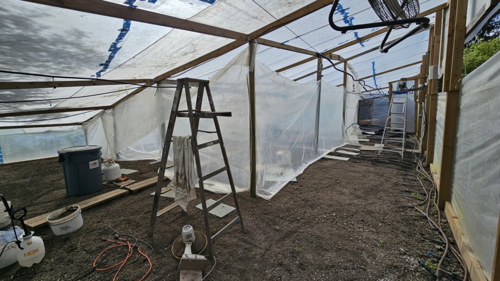 The brainwave was to make a section of the greenhouse smaller. It worked. Reducing from 2000 to 500 sq ft allowed the CO2 generator to get to 900 ppm in about 5 to 10 minutes. Also, I didn't know how much heat the generator was going to make. As it turns out the heat loss through the single layer of poly was much more than the heat generated and the temp in the greenhouse didn't rise.