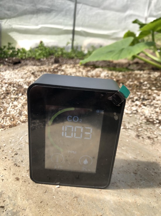 Inside the big hoophouse, under the CO2 bag between the 2 plants it reads 1003 ppm CO2. That is with the door fully open and a fan running.