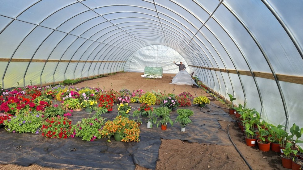 Had a nice morning drive and visit to see Gene Lrivieres patch in Connecticut today. He's a long time Grower. Chilly 50F when I arrived at 8am, but inside his 100ft x 30ft greenhouse with role up sides, the soil temp was 72F and the air temp was around 78F. Looks like Genes growing two plants back to back with about 1000 sqft for each Giant Pumpkin plant. plus some potted flowers on the far end.