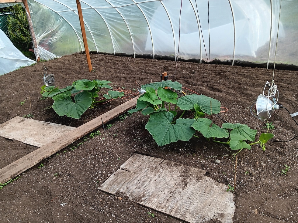 Both plants are around 4.5 feet long. The largest leaves are 23" across. I buried a couple nodes on the main vine already hoping to get some good root growth established early on. I am really happy with how things are going right now.