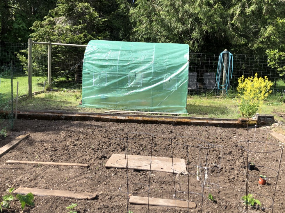 Hoophouse got moved to the prizewinner's spot for this year. We will grow 2 plants in the upper part of the patch, veggie garden below getting planted and is prepped and ready for the season.