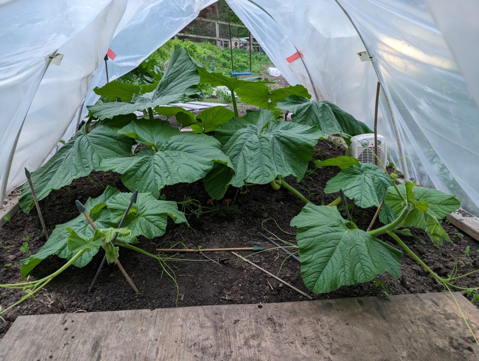 The 2480 plants are doing well and are quickly outgrowing the greenhouse too. This one doesn't have lighting or co2. Still double planted as the vines are really difficult to get laying down. One's main vine twisted and split on the way down, so I think I'll be selecting the other one in a couple of days or sooner.