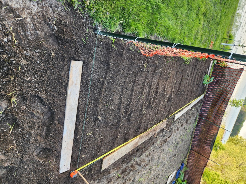 150 sq ft patch. 25' x 6'. Planted out the 1955 Werner. Starting to vine, healthy looking seedling. 1585 werner is alive but first few true leaves are off. Will see if it grows out of it.