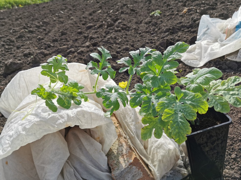 Watermelons have been planted. This is a European 205-242. It has outgrown somewhat and even managed to bloom.