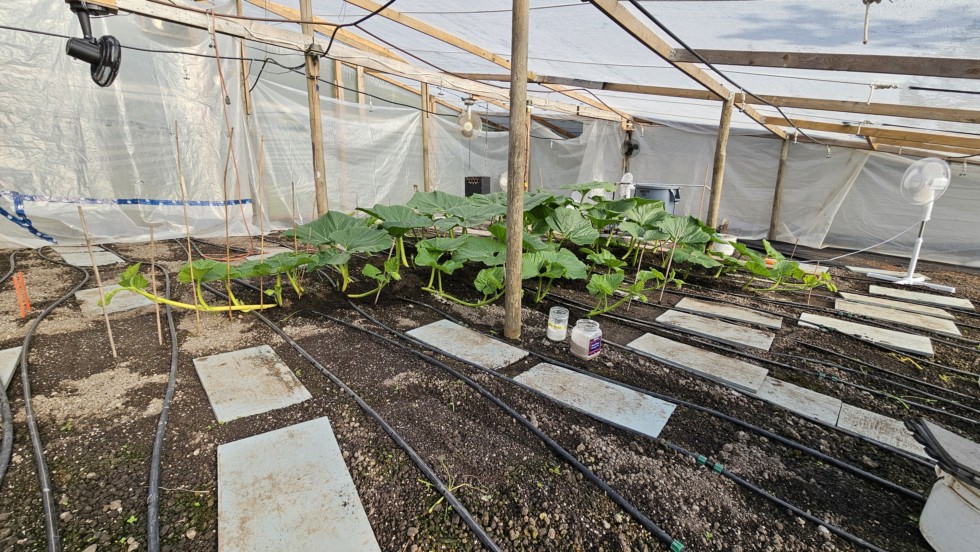 A fun picture....for a pumpkin grower....lol. Stakes are showing daily gains with the orange stakes at the 15 ft mark. Vine burying is happening but very few tertiaries popping up! 15 good secondaries formed.