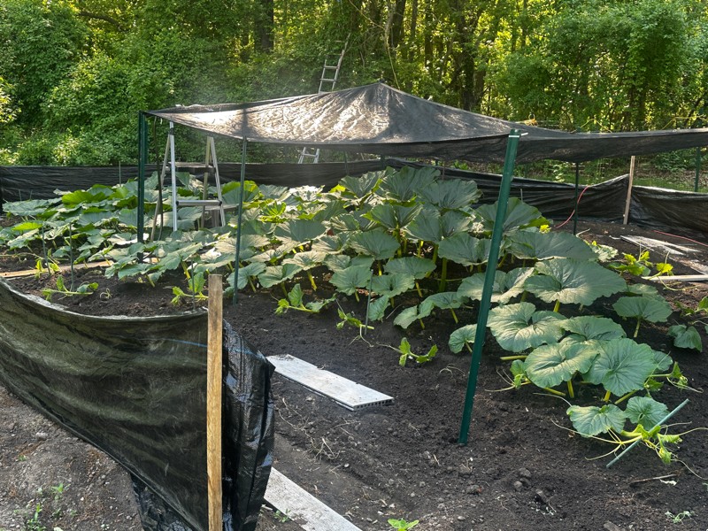 Patch update- The plants are really starting to kick into gear. Last weeks very hot temperatures caused some decent wilting on the leaves of my 1197 so I threw a shade cloth over it. My 1197 is now over 16 feet and over 15 feet wide. The 839 Sandercock is around 15 feet and about 12 feet wide. Few pumpkins in the tip of my 1197. Won't be long until the pollinations begin