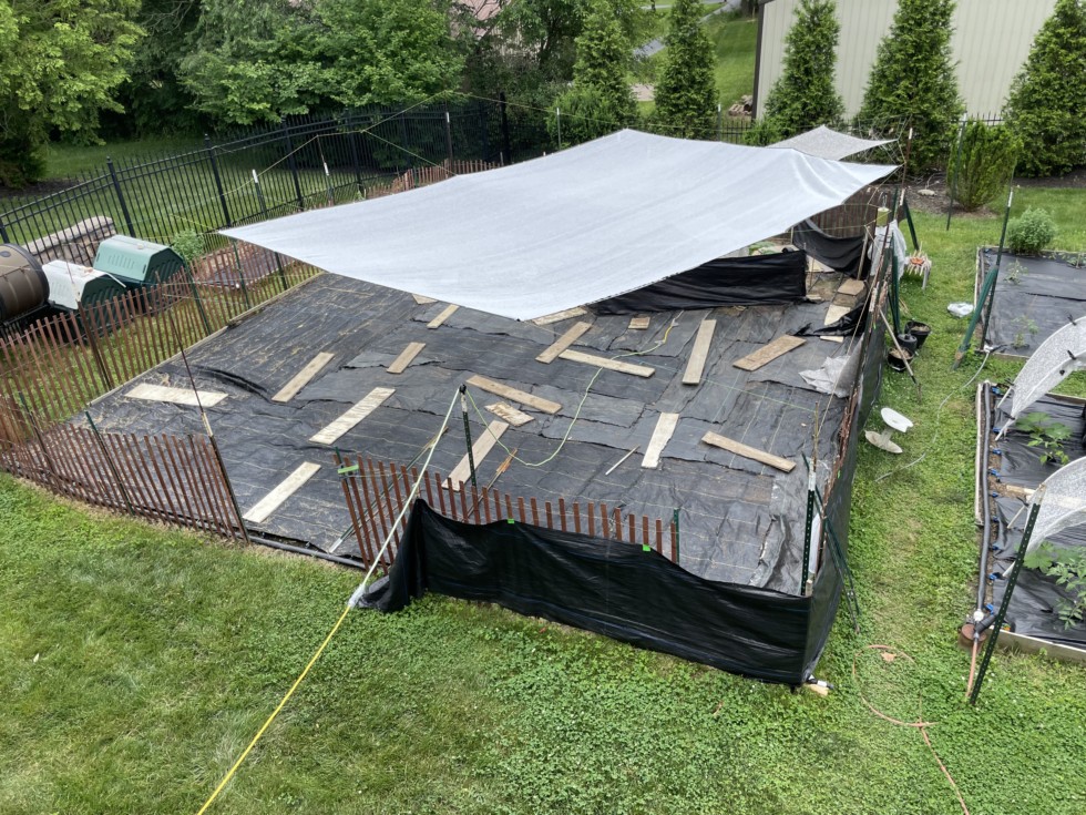 This is Patch A with a solar shade over it. The majority of the soil surface is covered with weed fabric. You can't see them here, but this is the home of 2 1747.5 Handy plants.