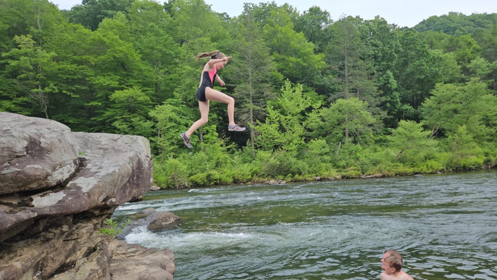 My daughter Stella loves to jump off the rocks. She is a river rat in the making.
