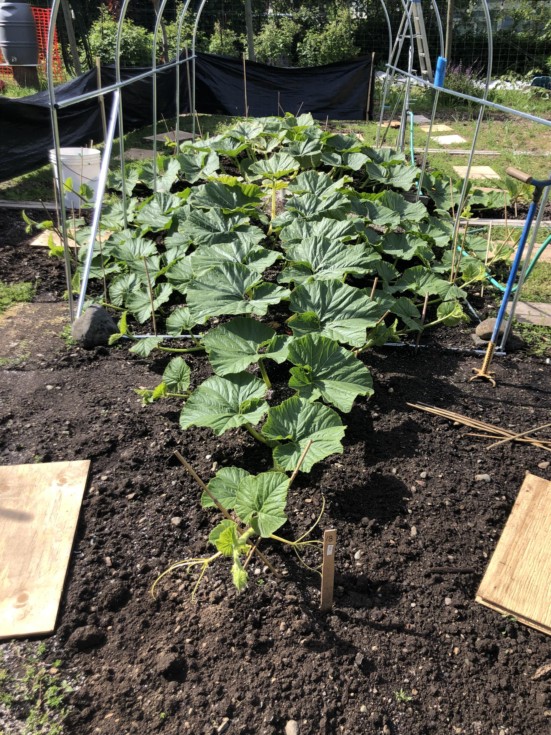 2212 Chan plant is looking good and getting wider. We have a weather shift finally, with warm and sunny on its way. Started these seeds on March 17, so it's been 75 days from seed soak to today. I can see why some of the initial growth is looking old and tattered. First females on the main vines have shown up on all the plants so pollination could be around mid June if all goes correctly.
