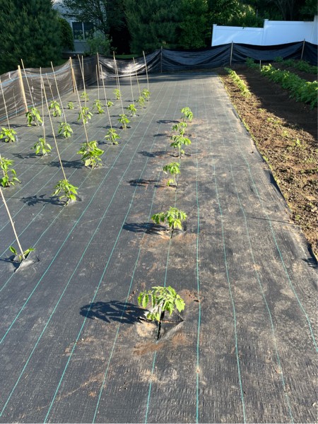 Got my tomatoes in the ground last night. Three 5.94 Young plants followed by three 7.95 Young plants. I just have to get some stakes for them. To the left are my peppers and eating tomatoes. I am trying the weed fabric this year.