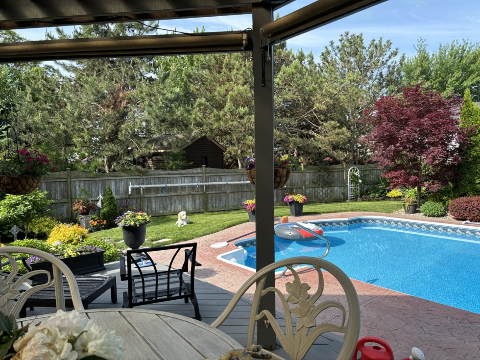 Mater Update. Planted two 8.51 and one 10.46 LaRue this morning. The yard has started blooming nicely. Bailey is having good time in the mornings early sunshine.