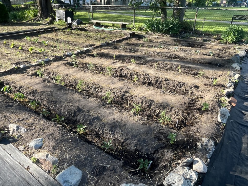 The vegetable garden is complete (except for one more plant). Probably the widest variety of plants we have grown in it including some herbs.