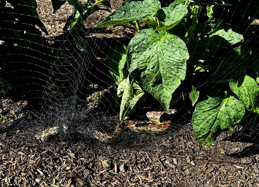 Snake and Tomatoes � Back home I found a 3 foot gopher snake hopelessly ensnared in the bird netting over the tomatoes. I thought he was dead but he came to life when I started cutting him out. I had to wrestle with him as I hacked...