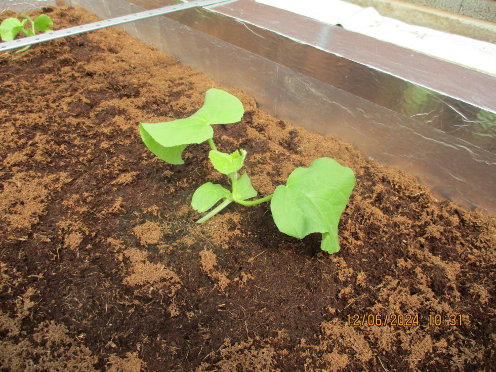 First Cantaloupe Melons planted in coir in lot2, only small but better in the bed than potting on. I have a heater in the tunnel and can maintain 60F overnight.