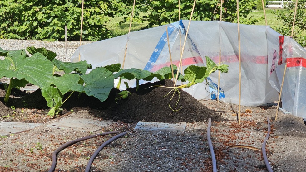 Barron 2144. This the Gienger Ramp. The main vine is raised with soil to lift the potential pumpkin up without disturbing any roots. The secondaries grow down the ramp and should make it easier to position pumpkins without disturbing roots. I've done this with the Barron 2404 and I love the way the it places the pumpkin in relation to the vines. Vine burying is continued normally...on top of the vines up the ramp.