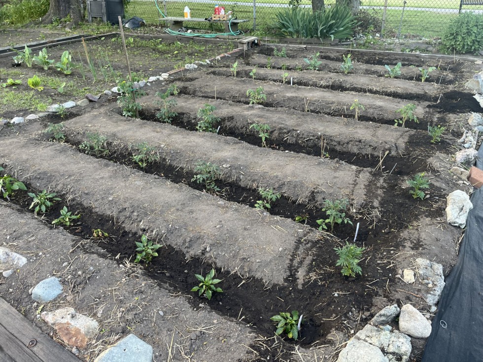 The vegetable garden. We pushed the rows out this year closer to the perimeter for more planting room in the trenches. Full list of plants coming soon.