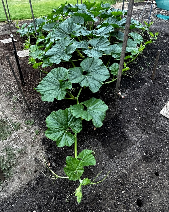 Slinky � She's got legs and she knows how to use them. The main vine has nice long spacing between leaf nodes giving the big leaves lots of room to grow. The main is 12' long now with the first female at 10 feet...