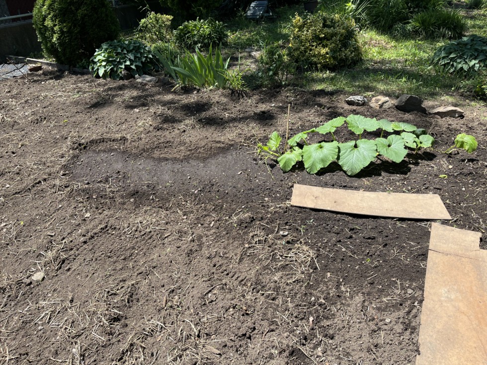 Based on the previous few years the plant should almost double in size over the next week. I made a slight depression ahead to make vine burying easier.