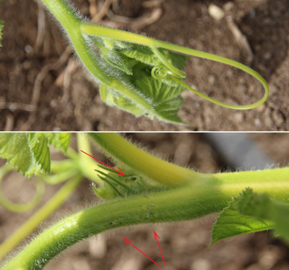 Today I discovered the first female in the tip of the main vine of the 2131.9, which was a nice thing. Less nice, so to say, was another discovery at the main vine tip. As shown in the lower part of the pic (red arrows pointing there) it looks like a slug has taken some bites from the surface of the main vine and from the male flower bud in the adjacent node.