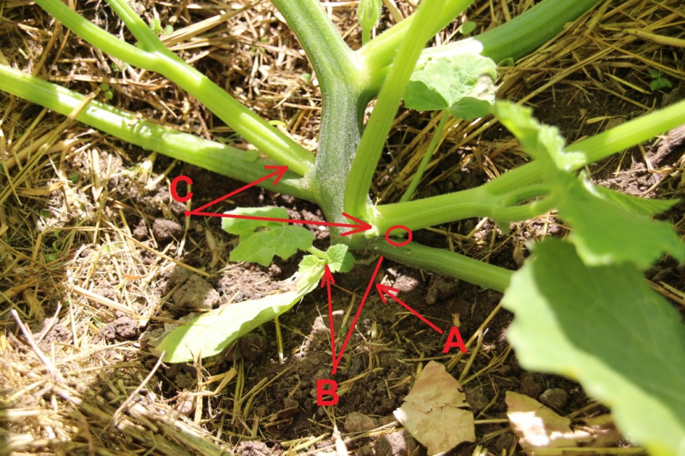 As the AG plants are treated already, but I wanted to take some pics of "before" and "after", I will do that treatment on one of my FP plants today, just to show the procedure. So that�s what it looks like before cosmetics. You know, parts A, B and C... A) hypocotyl (most of it buried in the ground in this case), B cotyledons (you can see only one, the other is hidden behind the vine, and you can see that a tiny secondary wants to emerge from the cotyledon node), C the first two secondaries (I will remove those secondaries and the leaves at those leaf nodes). So, before I take my small sharp knife to the plant, I dip the blade into the sulfur/ethanol dispersion to also disinfect the knife.