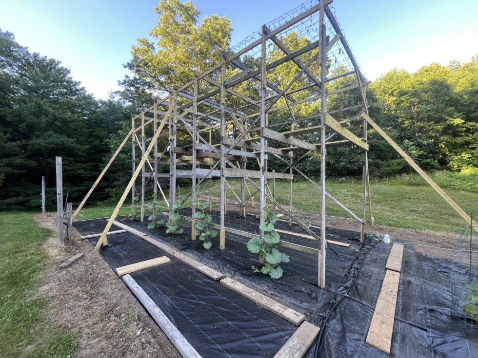 It's been two weeks since the LG plants have been planted they are about four ft tall. Looking back at last years pictures I would say there about a week ahead. I have seven plants on the trellis five on the west side and two on the east side. There's three 121 two 115 one each 154 and a 159. Got the weed mat and drip tape down that's most the work done.