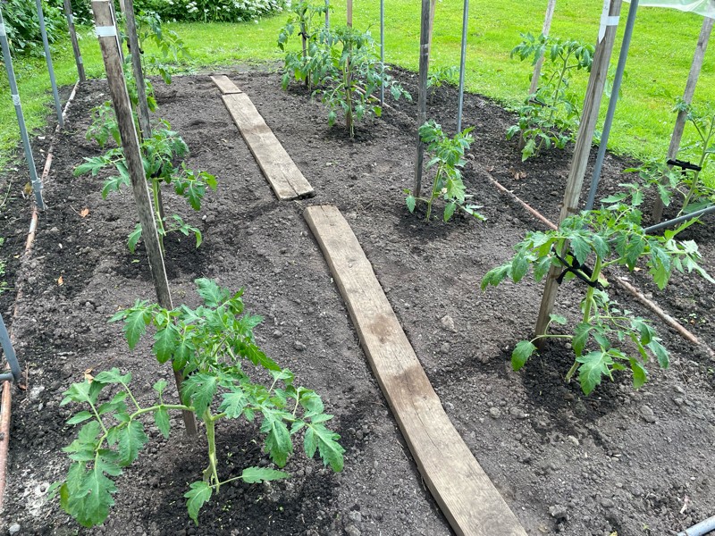 Haircut time in the tomato hut. They are in fast growth mode and ventilation is key to help with disease control. Cut leaves off close to the ground and all suckers were taken off.