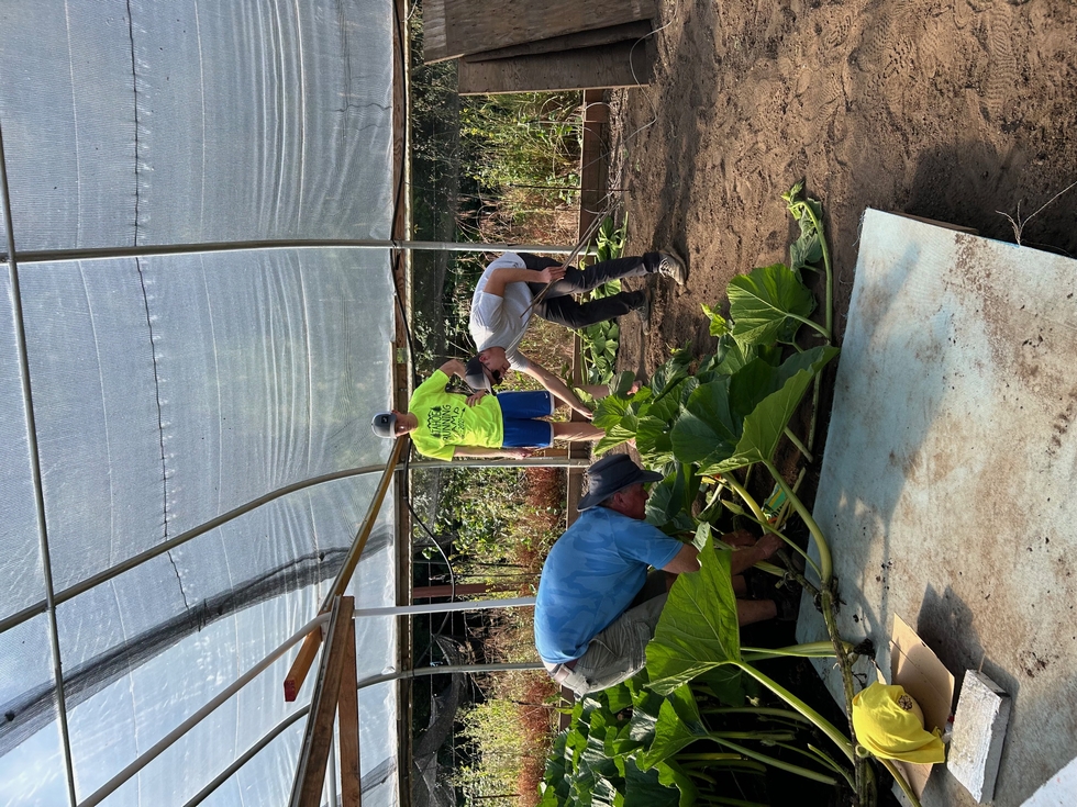 You absolutely will need help when doing this! Don't attempt to do it alone, or you will be sorry when you break a vine, or crack the space between your fruit & vines. I'm fortunate to have Owen (who has been forced into doing this for many years), my friend/fellow grower/greenhouse expert -Sam Felten, & Owen's girlfriend -Maya to help with the procedure.