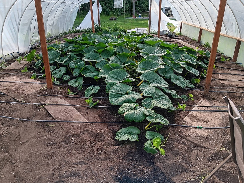 The 1931 Turner survived the heat a lot better. Only about 5 or 6 leaves burned on it. The first Secondaries are right at the edge of the greenhouse. I am going to have to roll the side up soon.